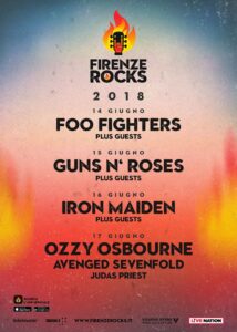 The legends of rock live on stage at the Ippodromo del Visarno are: June 14 Foo Fighters, June 15 Guns NāRoses, June 16 Iron Maiden, and June 17 Ozzy Osbourne.Ā At least two bands will open for each headliner. Avenged Sevenfold and Judas Priest will open for Ozzy Osbourne. The Kills, Wolf Alice, and Frank Carter & The Rattlesnakes will open for Foo Fighters. Volbeat, Baroness, and The Pink Slip will open for Guns NāRoses. Helloween, Jonathan Davis, and Shinedown will open for Iron Maiden.