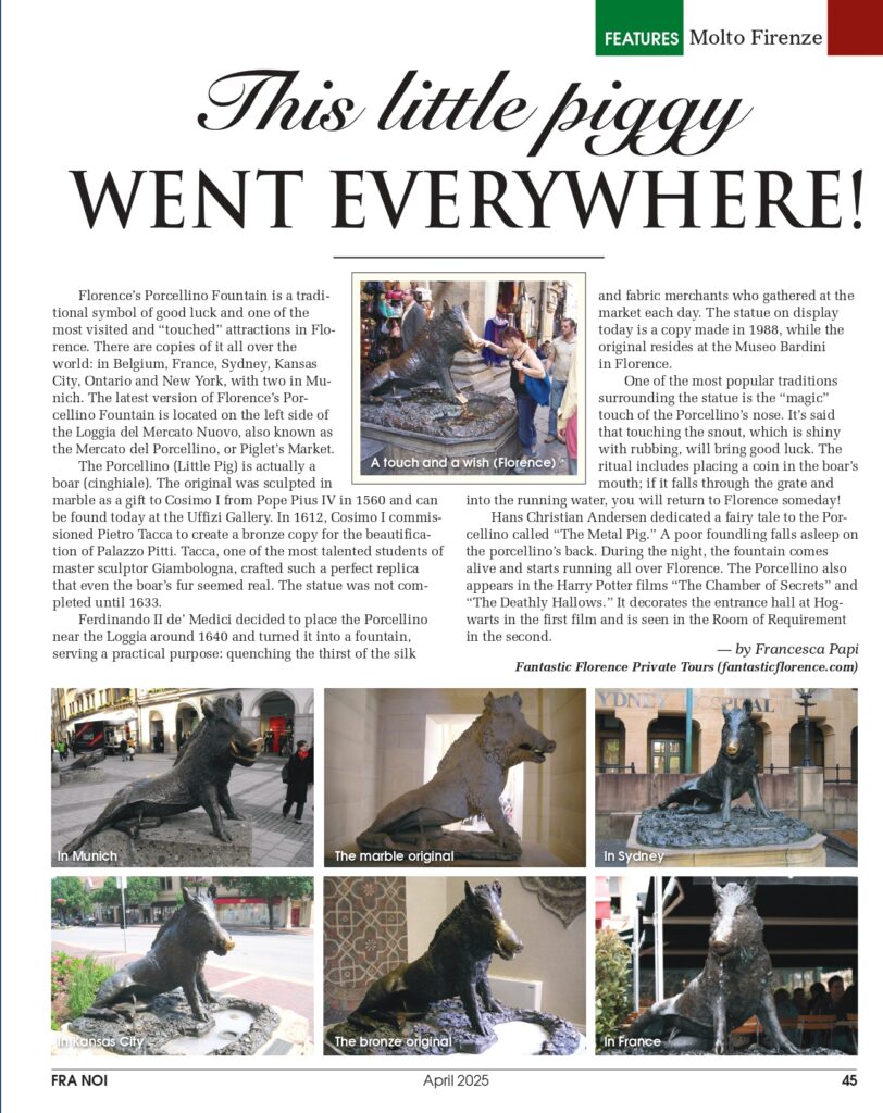 The porcellino also appears in the Harry Potter movies “The Chamber of Secrets” and “The Deathly Hallows”. It decorates the entrance hall at Hogwarts in the first and is seen in the Room of Requirement in the second.
