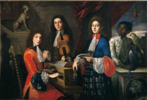 The Museum of Musical Instruments of Florence exhibits two large-scale paintings by Anton Domenico Gabbiani in the musical instrument section. They portray the Grand Prince Ferdinando de’ Medici surrounded by his court musicians. The elegantly dressed young musicians proudly show off their violas, cellos, a “lirone”, or lira da gamba, and a cello with a precious silver tailpiece used to increase its sonority. In this painting, Anton Domenico Gabbiani depicts a portrait of three musicians from the Medici court, of which Gabbiani was the official painter. The painting was made around 1687 for the then twenty-four-year-old Prince Ferdinando de’ Medici, son of Cosimo III. Ferdinando de’ Medici was a great lover of music (and a musician himself), and he commissioned several musical-themed paintings from court artists.