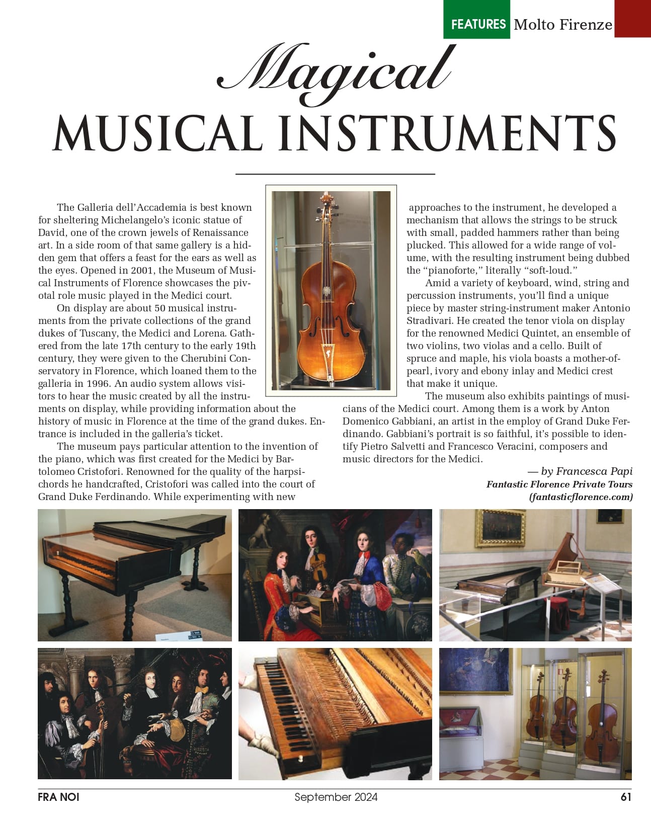 Amid a variety of keyboard, wind, string and percussion instruments, you will find a unique piece by master string-instrument maker Antonio Stradivari (Cremona, 1643-1737). He created the tenor viola on display for the renowned Medici Quintet, an ensemble of two violins, two violas and a cello. Built of spruce and maple, his viola (made around 1690) boasts a mother-of- pearl, ivory and ebony inlay and Medici crest that make it unique. The viola on exhibit at the Musical Instruments Museum of Florence at Accademia Gallery is a one-of-a-kind by Stradivari and is perfectly conserved in its original condition, showing elegance and outstanding sophistication. The famous string quintet, depicted in the painting by Giovan Antonio Gabbiani displayed in this same museum, with Ferdinando surrounded by his musicians, was unfortunately dismantled. Besides the remarkable viola, the Galleria dell’Accademia still preserves the cello, which is also adorned with the Medici coat of arms. After the extinction of the Medici family, the Grand Duchy of Tuscany was assigned to the ruling Austrian family of the Habsburg-Lorraine. Regrettably, during the Lorraine period (1737-1860), many string instruments underwent modifications to adapt them to the tastes and musical repertoire of the time. In particular, the position of the neck was altered by bending it backward to increase its resistance to string tension, resulting in a brighter sound. Consequently, the fingerboard was elongated to expand the range of notes towards the higher pitches. The Medici viola is the only instrument in the world among those created by the famous Cremonese luthier that has remained perfectly preserved in its original structure, without any retrogression of the neck or reduction in size.